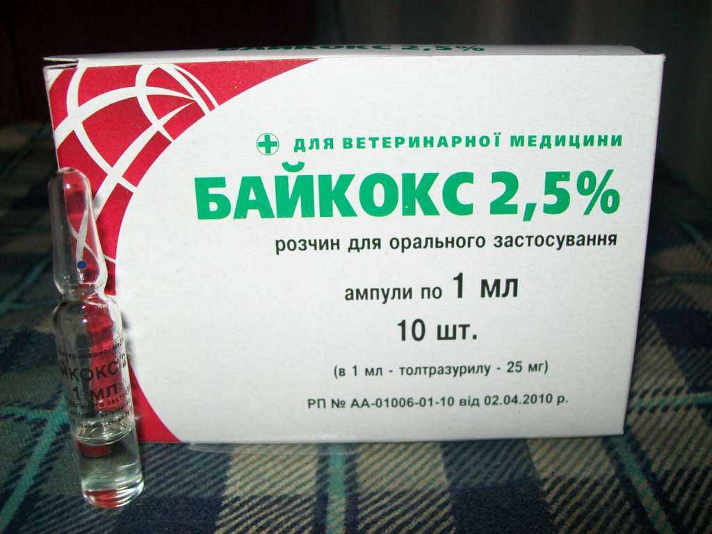 Используют байкокс 2.5% в форме раствора. Добавляют в воду для питья.