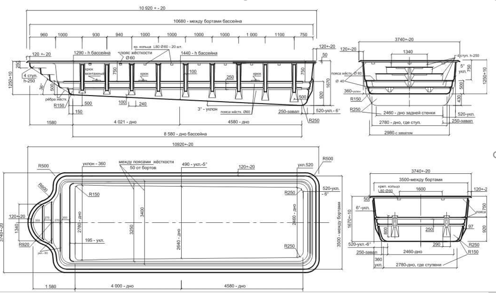 Капитальные утиные бассейны, требующие финансовых затрат, строят для водоплавающих, поголовье которых более 100 шт. Для справки — бассейн с размерами 7 на 7 м удовлетворяет потребности около 300 уток. Более объемные считаются нерентабельным, так как расходы на их постройку долго окупаются. Обычно большой водоем доверяют строить специалистам, умеющим работать по чертежам и схемам. Одним из примеров может быть водоем, возведенный по ниже приведенному чертежу.