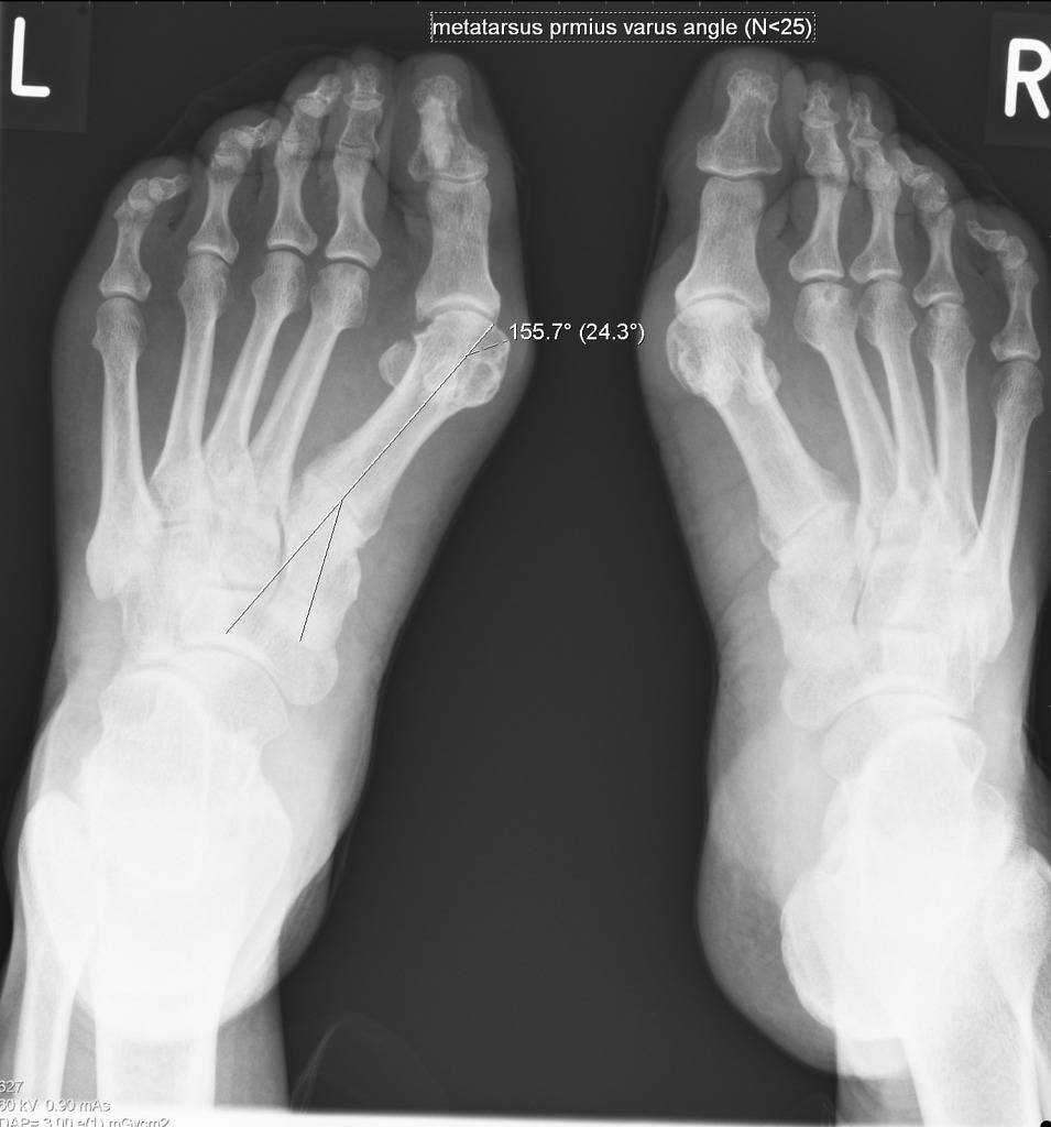- Средняя (2 стадия) – на этой стадии появляется выпирающая косточка на боковой поверхности стопы, а пациент испытывает сильную боль при ходьбе и не может носить обувь без дискомфорта. Со стороны специалистов симптомы средней стадии вальгусной деформации следующие – высота свода до 10 мм, угол наклона пятки до 10 градусов, угол высоты свода 150-160 градусов.