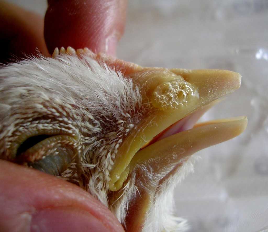 - сначала возникает небольшая шишка между глазами и клювом птицы;