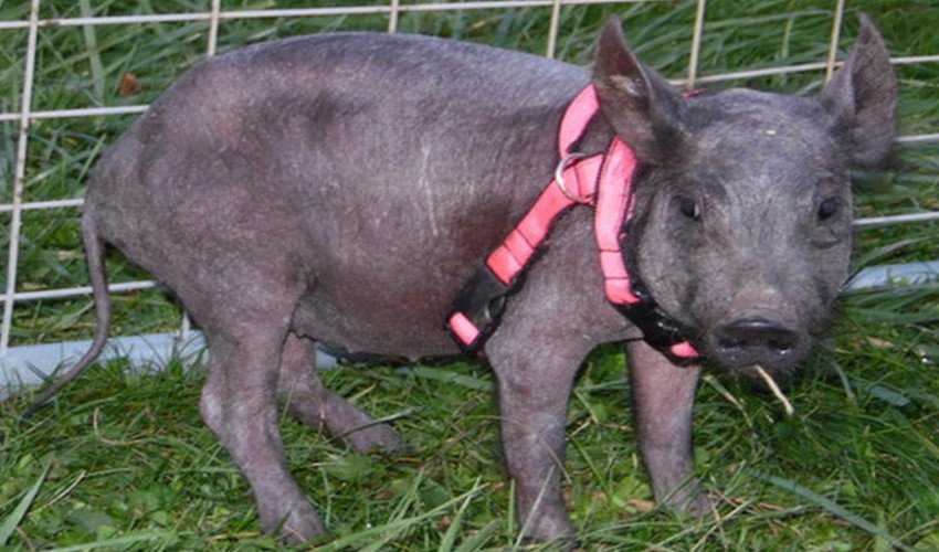 Лысая мексиканская. Не имеет щетины, серебристая или серая. Рост её составляет 60 см, особь набирает вес до 90 кг. Внутреннее строение близко к органам человека. Часто используется в лабораториях.