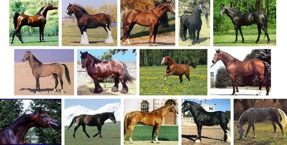 | Орловская рысистая Белорусская упряжная Торийская Клеппер | Арденская Клейдесдальская Першерон Брабансон | Ахалтекинская Арабская Терская Чистокровная верховая Буденновская | Казахская Алтайская Киргизская Якутская | Шетлендский Хоккайдо Готландский Исландский Сардинский |