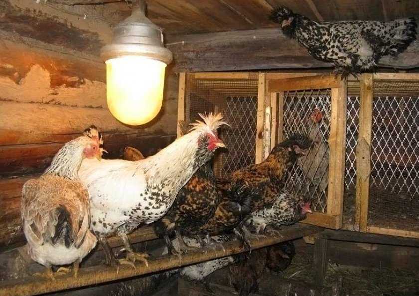 Поэтому важное значение имеет не только время, на которое включается лампа, но и её яркость. Гнездовые места должны иметь освещённость 5-15 Лк, места для кормежки — 50-60 Лк