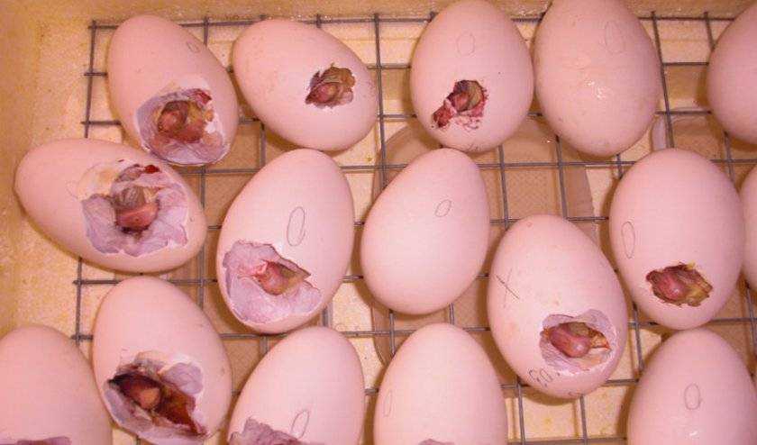 - С 19 по 21 день. Перед вылуплением потомства нужно слегка понизить температуру в инкубаторе (до 37,5 °C) и увеличить влажность до 65%. Охлаждение и переворачивание кладки прекращают. В эти дни птицы открывают глаза и начинают выбираться из скорлупы.