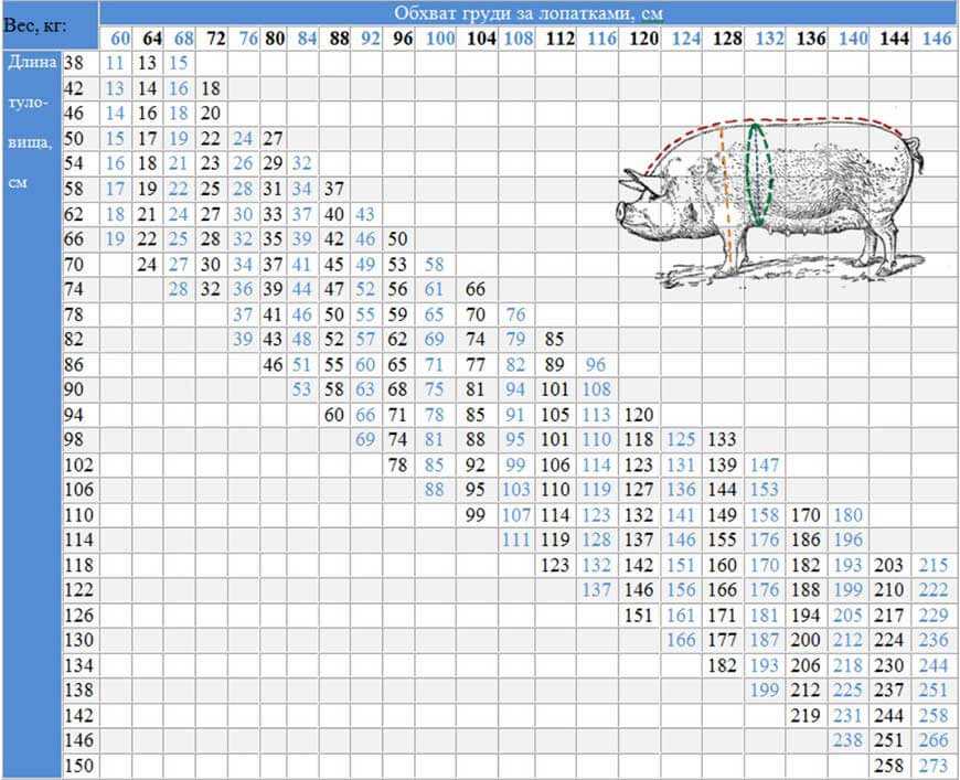 Для определения примерного веса после обмеров свиньи, данные совмещают с цифрами в приведенной ниже таблице, и смотрят вес свиньи на пересечении двух линий (горизонтальной и вертикальной).