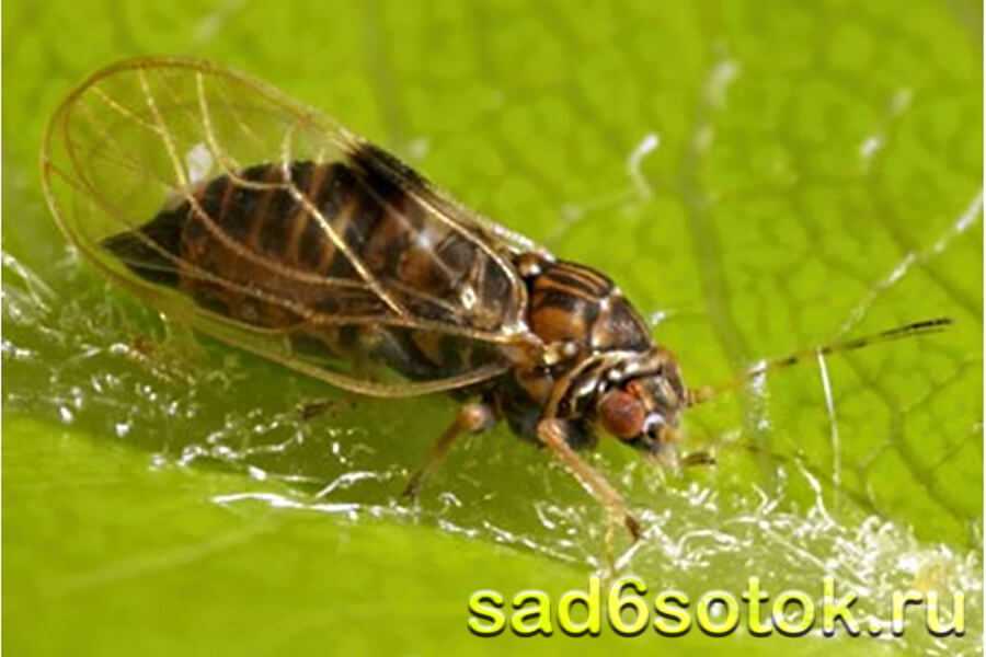 Паразиты настолько мелкие, что многие дачники путают, их с белокрылкой. Однако, когда подходишь ближе к деревьям, можно слышать треск от их прыжков, словно скачут кузнечики. Это микро-насекомое из рода равнокрылых, с хорошо развитыми крылышками, которые в спокойном положении лежат кровлеобразно вдоль тела. Головка плотная, формы треугольника с двумя большими глазами и тремя маленькими, также на голове есть небольшой хобот, с его помощью вредитель пожирает грушу. Когда паразит не питается, он прижат к бедрам лапок спереди.