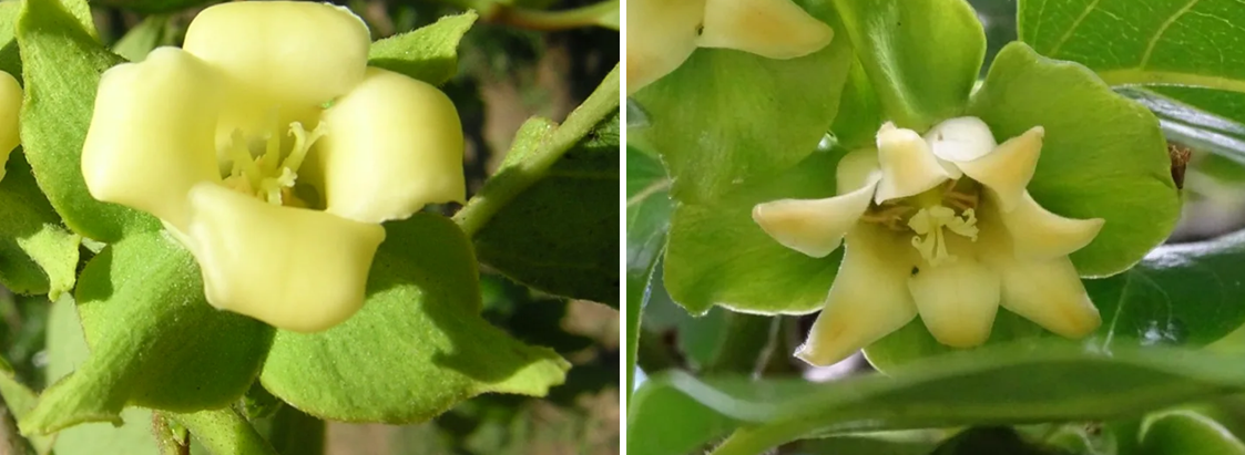 - Особенностью деревьев рода diospyros является наличие цветков и женского, и мужского типа, отличающихся друг от друга по форме и структуре. Женские цветочки более объёмные, имеют всего 4 плотных крупных листика. Мужской цветок по форме напоминает колокольчик, он более мелкий и имеет слегка зеленоватый окрас.