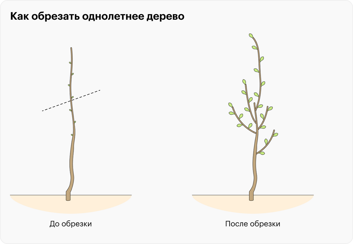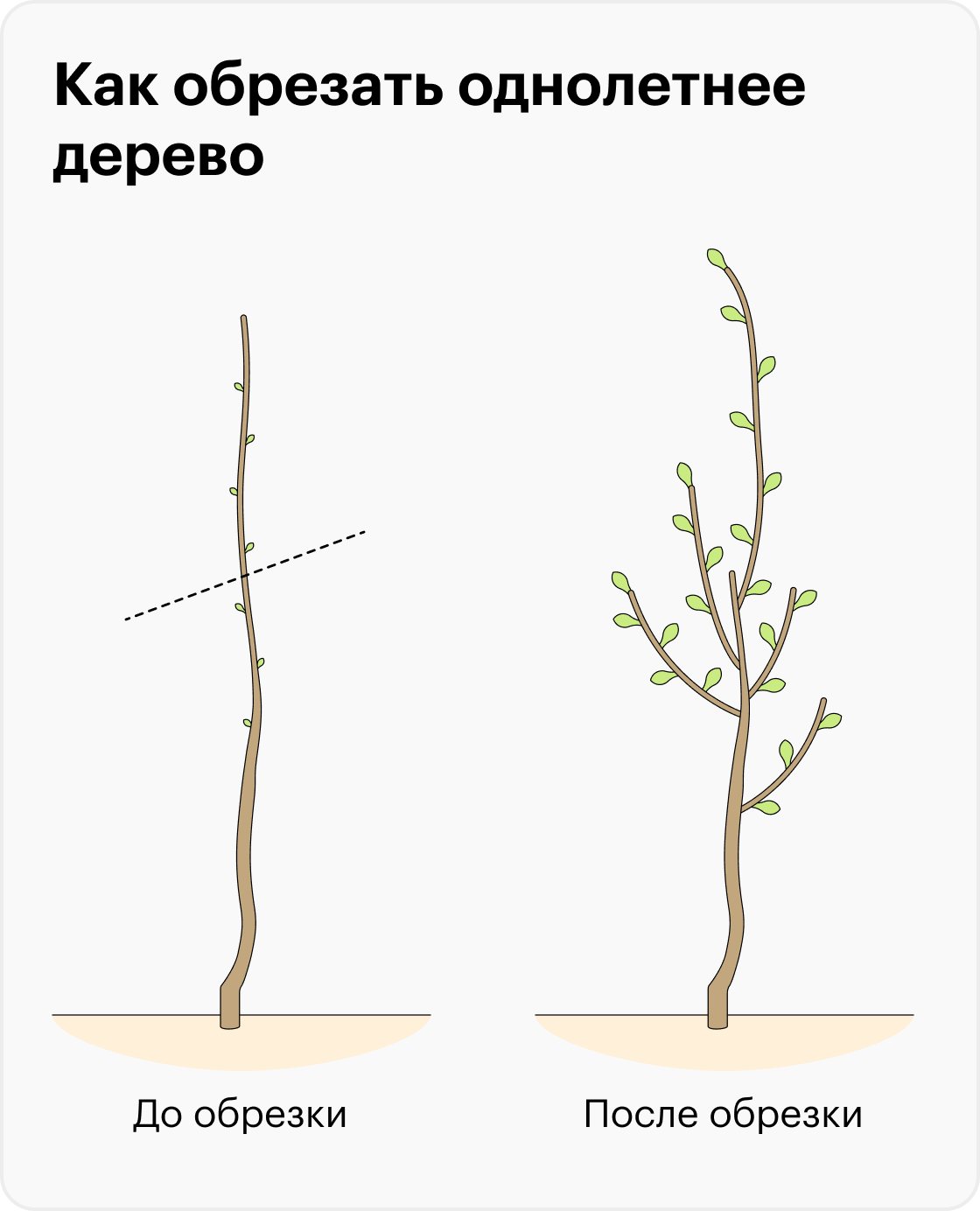 После посадки однолетние деревья без кроны обрезают только в случае, если растение сильно вытянулось и еще не разветвилось. Если оно растет нормально, его оставляют без подрезки.