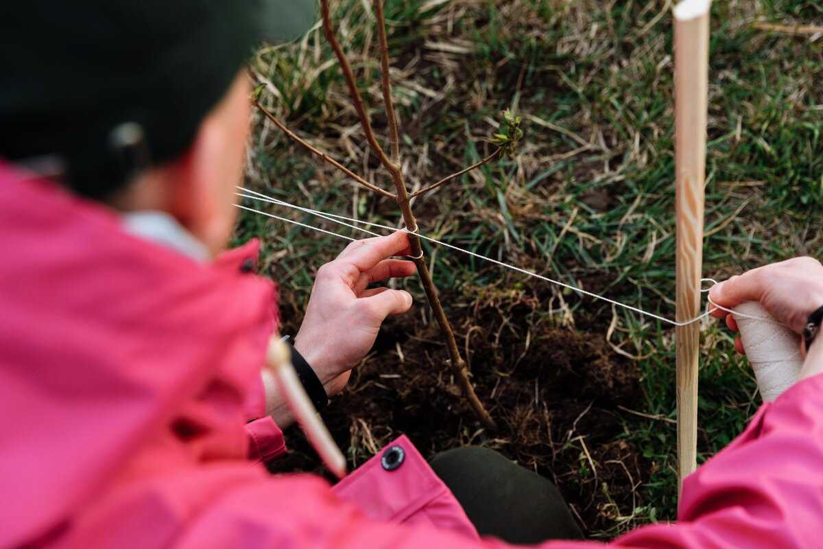Последним штрихом будет подвязка деревца к опоре, используйте мягкий материал, чтобы он не повредил кору.