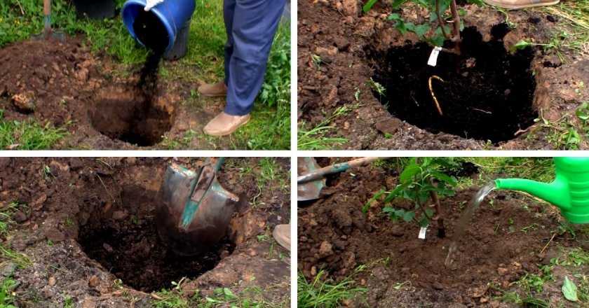 В основание ямки рекомендую бросить лопату керамзита или битого кирпича для дренажа, сверху положить ведро смеси торфа и перегноя в равных долях, полить ведром воды и на эту смесь установить корни. Далее остается хорошо присыпать корни и уплотнить почву, чтобы между корешками и грунтом небыло пустот. В конце нужно полить саженец еще одним ведром воды и замульчировать поверхность почвы торфом или перегноем слоем в 2 см.