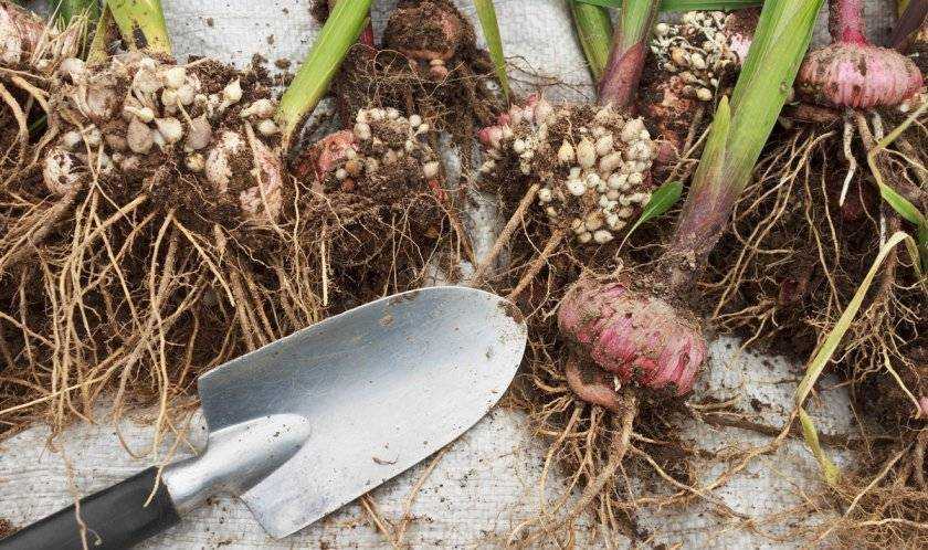 Затем, отступив от центральной части гладиолуса 20 см, следует воткнуть в грунт вилы и аккуратно вытащить ком земли вместе с луковицами, перекладывая его на подготовленный плотный брезент, плёнку или любой другой прочный материал. Слегка подсушив грунт, из него извлекают луковицы, выбирают деток и удаляют у них корни.