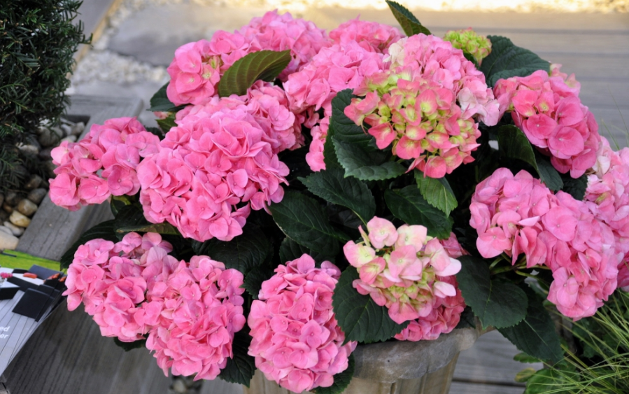 В горшках «прожорливой» гидрангее понадобится большее количество подкормок, минимум 2 в месяц. Потребность в питании легко определить – если у гортензии светлеют листья, значит, вы ее мало удобряете. Весной и летом, как и для растений открытого грунта, в подкормках должны преобладать фосфор и калий. Осенью в составе удобрений должны присутствовать калий и железо.