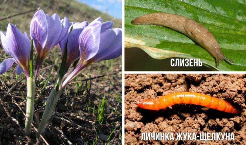 Если на шафране обнаруживают слизней, их собирают вручную. Для профилактики во время посадки луковицу окружают слоем крупнозернистого песка. Серые пятна на не полностью раскрывшихся плоских лепестках говорят о вирусном заболевании. Как можно скорее такие экземпляры надо выкапывать и уничтожать. Почву дезинфицируют горячим раствором перманганата калия.