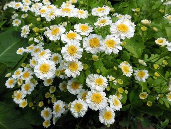 Пиретрум девичий (Pyrethrum parthenium) Цветочки белые с желтой серединкой, они могут быть как простыми, так и махровыми. Самые популярные сортовые разновидности – «Даль Уайт» с белыми пуговицеподобными цветочками, а также «Гольдбаль» с махровыми желтыми соцветиями.