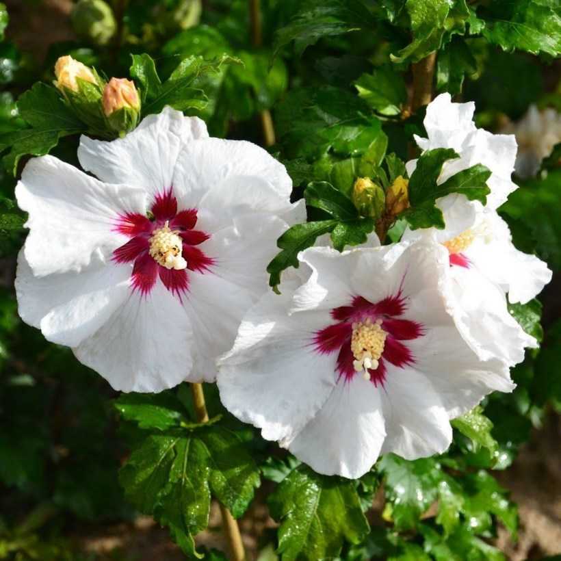 - Гибискус сирийский, его же называют садовым. Растет аккуратным кустом высотой до 3 метров. Раскрытые соцветия напоминают блюдца. Цветение начинается в июле и продолжается до осени. Есть сорта с простыми и махровыми цветками белого, красного и розового окраса. Зимой этот вид может выдержать до -25°C. Летом для цветения ему нужна теплая погода. Предпочитает нейтральный грунт и места, освещенные солнцем.