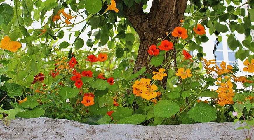 Некоторые садоводы считают настурцию лучшим растением для посадки в приствольном круге у плодовых деревьев и ягодных кустарников. Высаживать нужно по 2–3 растения на квадратный метр.
