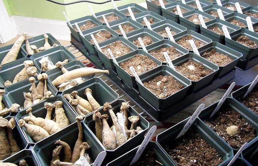 Как я уже отметила, сухой посадочный материал не походит для выращивания. Необходимо хранить его в условиях умеренной влажности: не более 70 %. Если вы увидели трещину или царапину на посадочном материале, опудрите его древесным углем. На корневую шейку лучше нанести мел.