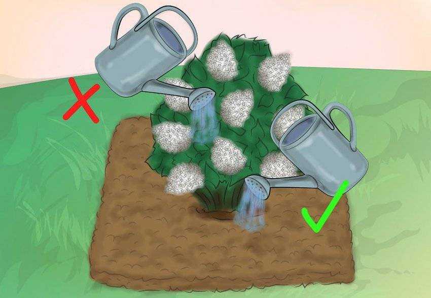 Поливать стоит регулярно, но необходимо следить за влажностью почвы, чтобы избежать ее переувлажнения. Для сорта «Пастель Грин» можно допускать пересыхание грунта. Поэтому если высадили вы ее на дачном участке, то не стоит сильно беспокоиться, поскольку кустарнику подойдет полив и 1 раз в неделю. Воду следует заливать прямиком под куст, поскольку скопление влаги на листках и соцветиях может навредить растению.