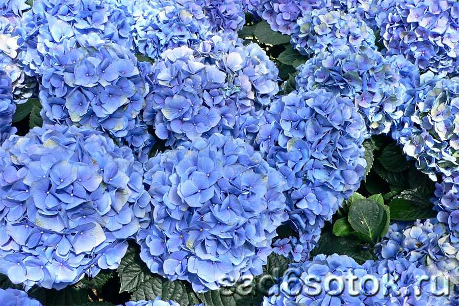 На кислых почвах гортензия крупнолистная меняет оттенок с розового на голубой. Можно искусственно получить голубой цвет, подсыпая к кусту торф, хвою и поливая раствором железного купороса, квасцов