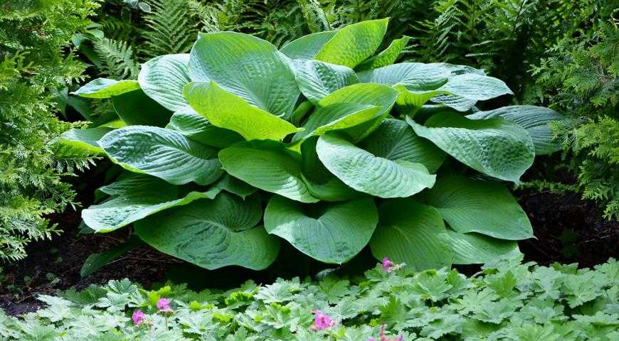 Хосту можно сочетать с многолетними растениями, любящими тень: