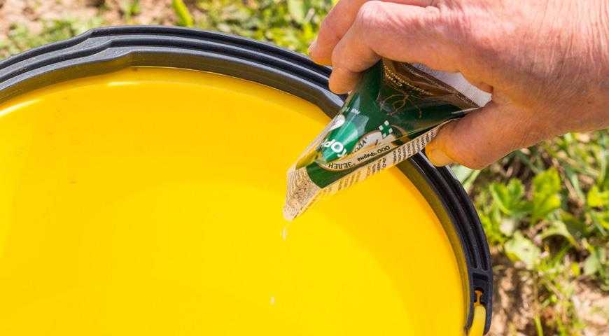 После обрезки (и даже если ее не было) корни опускаются в дезинфицирующий раствор. Жидкость готовят из медного купороса, разведенного в воде (30 гр на ведро). Корни саженца опускают в ведро с дезинфектором и оставляют на несколько часов.