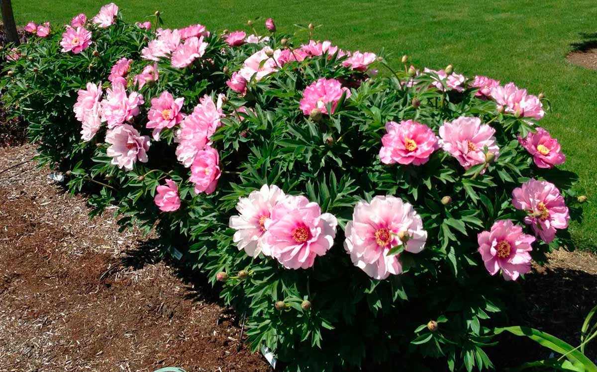 Восхитительно в саду смотрятся яркие цветки Bowl of Beauty с огромным количеством тычинок. Или же компактные кусты пиона сорта Неон, густо покрывающиеся махровыми цветками, которые смотрятся на нем как порхающие бабочки.