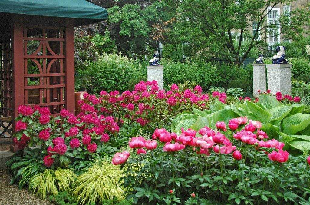 Красочные пейзажи создают пионы с цветущими кустарниками