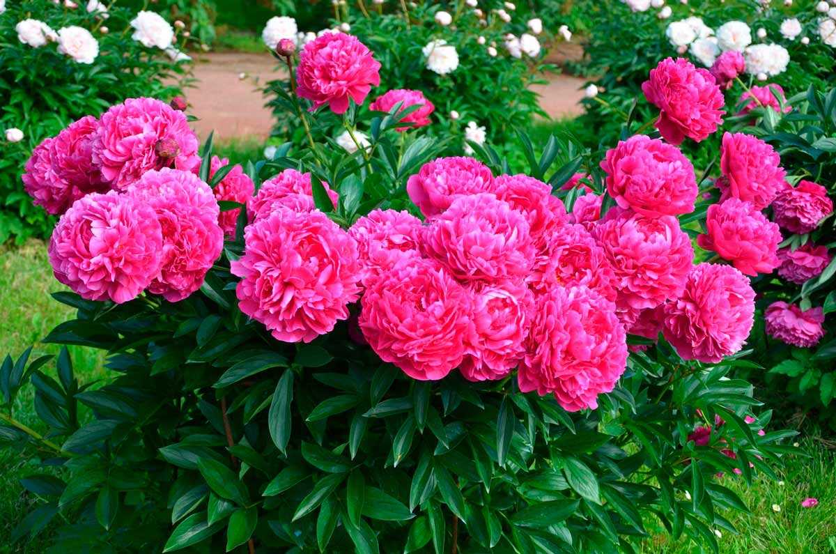 С белыми или коралловыми пионами будут сочетаться яркие темно-красные цветы, например гвоздика или кроваво-красная гейхера. Нежность розовых пионов подчеркнет темная декоративная зелень туи или же кусты барбариса. Великолепно пионы смотрятся в клумбе с морозниками.