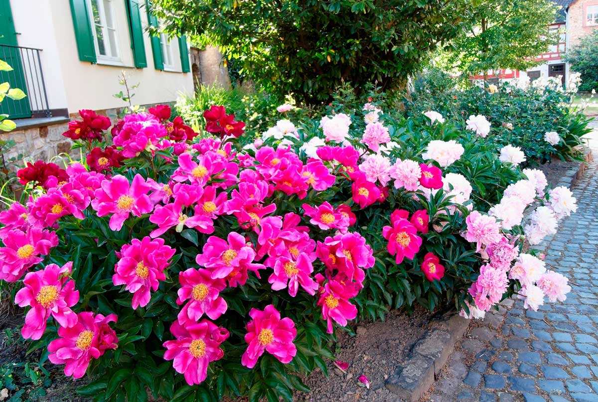 С помощью пионов можно создать клумбу, которая особенно декоративно смотрится в июне, или превратить цветник в сад непрерывного цветения, в котором пионам солирующая роль будет отведена в начале лета, после чего насыщенная зелень кустов пионов будет служить фоном для других цветов.