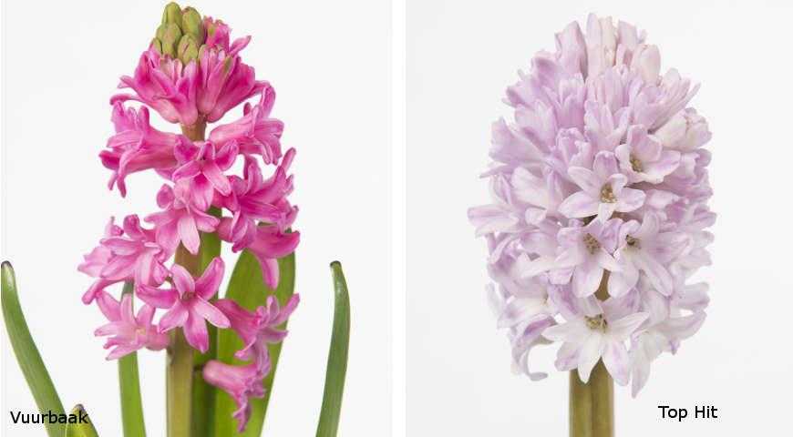 Период цветения гиацинтов приходится на апрель и начало мая и длится примерно 25 дней (сокращается в теплую весну и удлиняется в холодную). Стебель цветоноса прямой и мощный, появляется раньше чем заостренный, строгий, прямой, собранный в розетку листьев. Длина листьев немного короче или равна цветоносу.