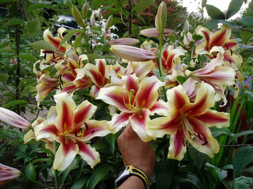 К таким растениям относятся гибридные, а также садовые виды (к примеру, лилия Давида, Тигровая лилия и т. д.). А еще к ним относится и голландская лилия. Такие растения являются обладателями сравнительно небольшой луковички. Они нормально растут и развиваются практически в любых условиях. Им не страшна ни засуха, ни чересчур низкая температура воздуха. Этот вид зацветает очень рано, в июне. Имеются компактные карликовые сорта, у них высота стебля не бывает более 40 см, однако имеются и такие сорта, длина побегов которых доходит до 100 см. Цветок имеет форму чаши. На одном кустике может вырасти достаточно большое количество цветков.