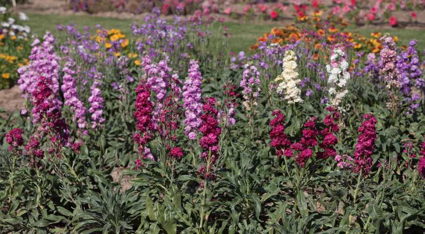 Популярный цветок среди садоводов не только из-за продолжительного декоративного цветения, но и приятного запаха, который источает растение в этот период. В народе маттиолу часто называют «ночная фиалка», поскольку аромат цветов усиливается в ночное время. Для выращивания применяют только два вида – маттиолу двурогую и седую. Растение нетребовательно к уходу и условиям выращивания, может обильно цвести даже в затемненных и сухих участках. Цветки простые, собранные в кистевидные соцветия, чаще всего имеют бледно-лиловый окрас.
