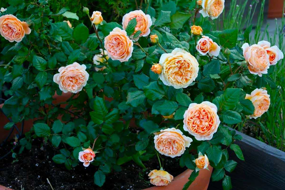 - Пэт Остин. Сорт хорошо растёт в полутени, устойчив к холодам. Крупные полумахровые цветы окрашены в ярко-медный цвет, плавно переходящий в нежно-кремовый оттенок. Цветение начинается рано, продолжается беспрерывно и достаточно долго. Аромат напоминает запах розового масла.