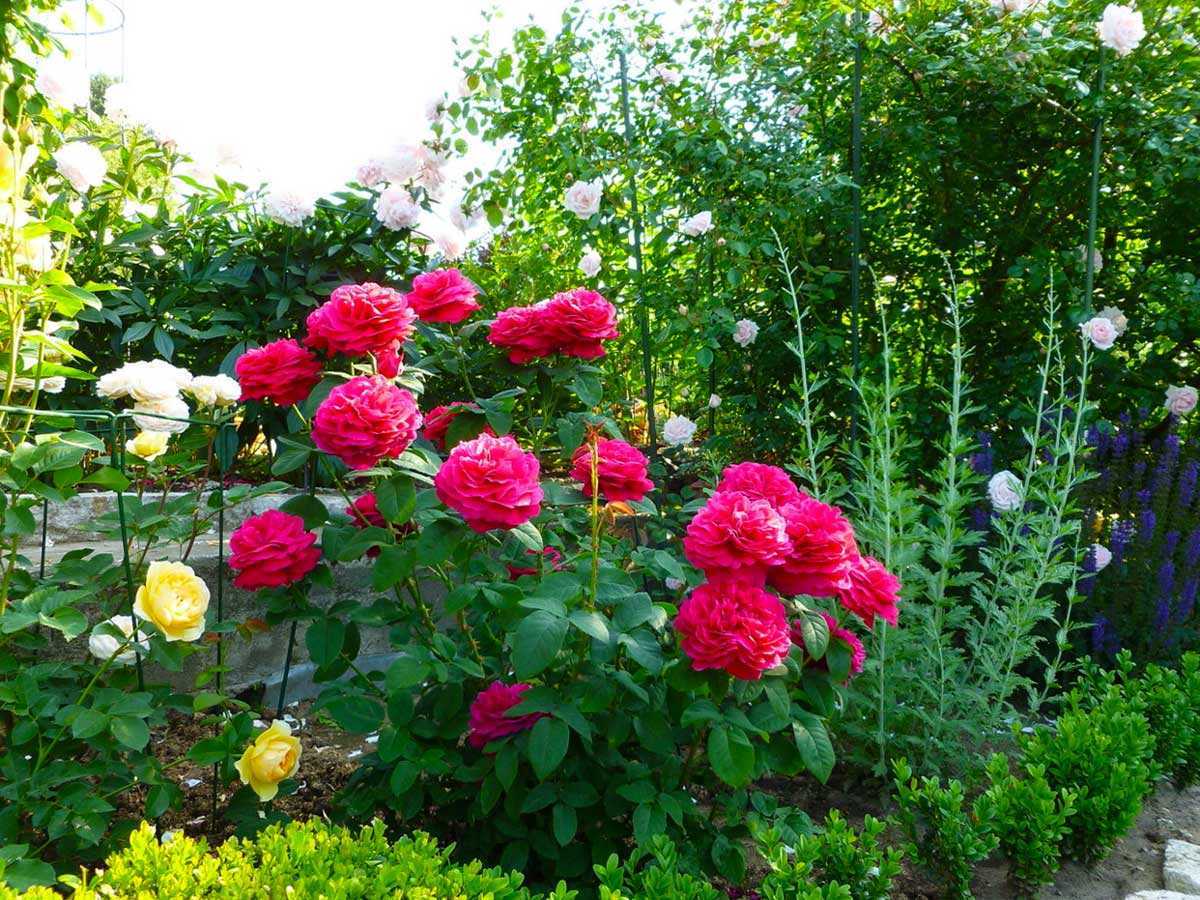 - Гертруда Джекилл – махровые цветы в виде плоской розетки или чашевидной формы насыщенного розового цвета со сладким запахом розового масла. К центру бутона оттенок становится ярче. В холодном климате куст высокорослый, в южных районах он растет плетистым и достигает трех метров в длину. Цвете два раза за сезон, второе цветение менее обильное.
