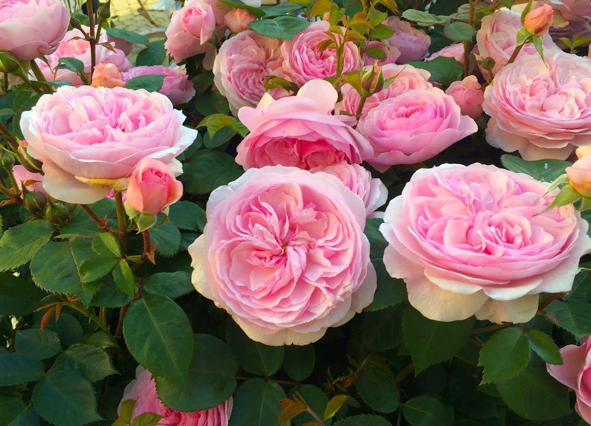 - Остин Гертруд Джекипп. Сильнорослая кустовая роза, отличающаяся обильным и продолжительным (с мая по ноябрь) цветением. Аромат напоминает запах старых роз с нежными нотками мирры. Ярко-розовые махровые цветы, равномерно распределяясь по всему кусту, полностью покрывают его. Сорт отличается полнотой цветения и декоративным видом. Растение обладает устойчивостью к различным болезням, неплохо переносит зиму. Взрослый куст достигает высоты в 250 см, его диаметр составляет около 1 метра.