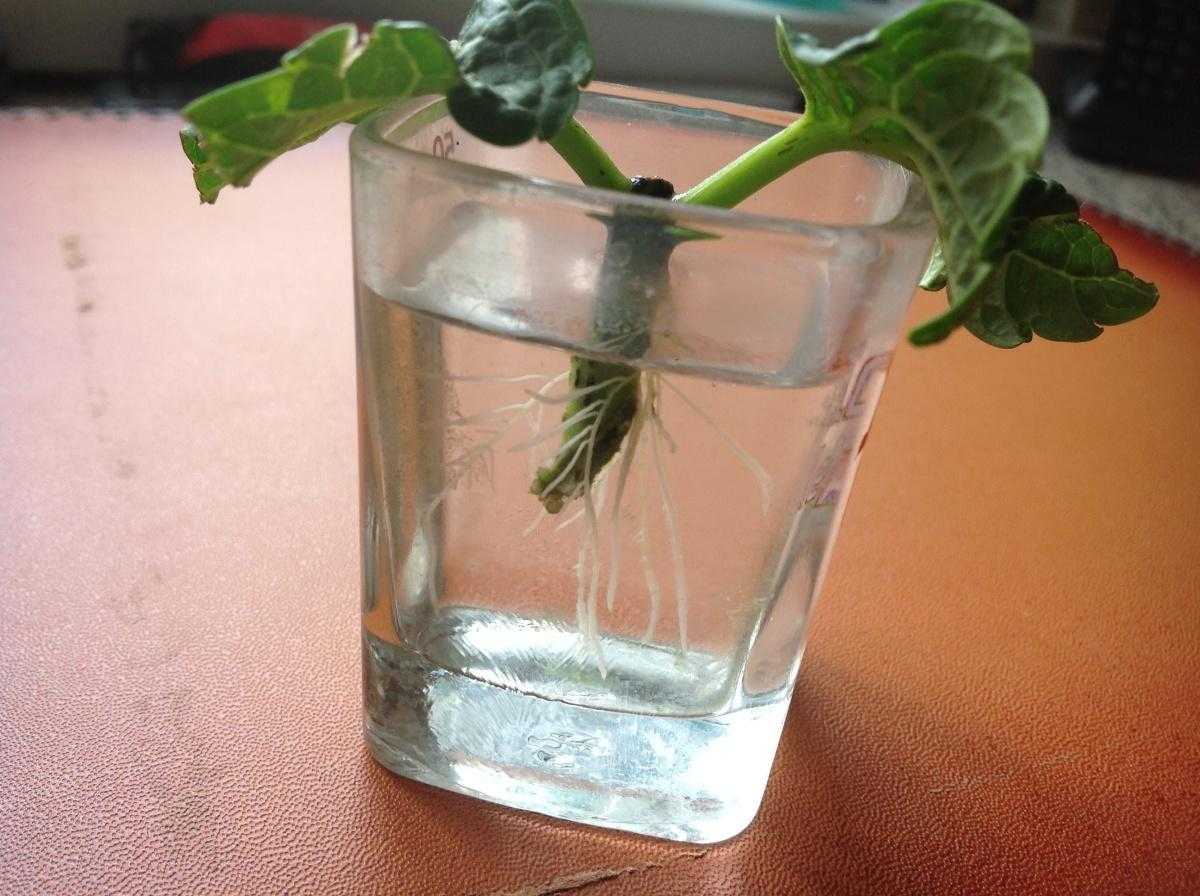 Если не накрывать черенки, их дважды в день опрыскивают из пульверизатора. На укоренение уходит 3 – 4 недели. После этого должны появиться новые листки.