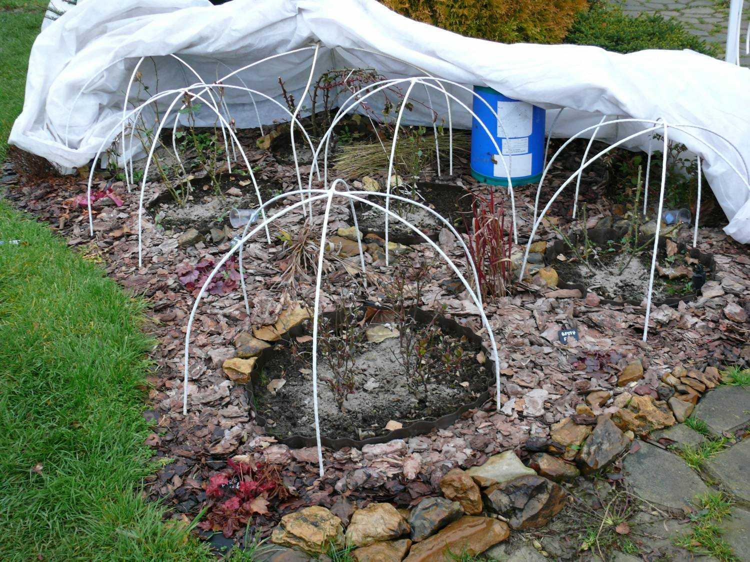 - Зимой формируется каркас, сверху закрепляется укрывной материал.