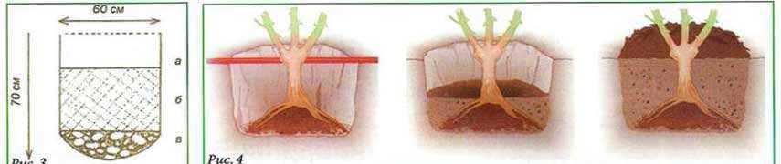 Почва подготавливается заранее: перед непосредственной высадкой вырыть яму 1-1,5 м в глубину и обработать. Это значит, засыпать дренажный слой (щебень), ввести подкормку и присыпать земли. Почву хорошо прорыхлить, если нужно, прочистить от камней.
