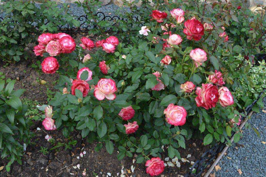 - Пышные витиеватые цветки. Чаще всего кремового цвета с белыми и розовыми вкраплениями. Некоторые имеют окантовку на лепестках насыщенно-розового цвета. Другие цветовые вариации: белые лепестки с малиновой или красной окантовкой и однотонные нежно-розовые лепестки. Розы источают тонкий аромат.