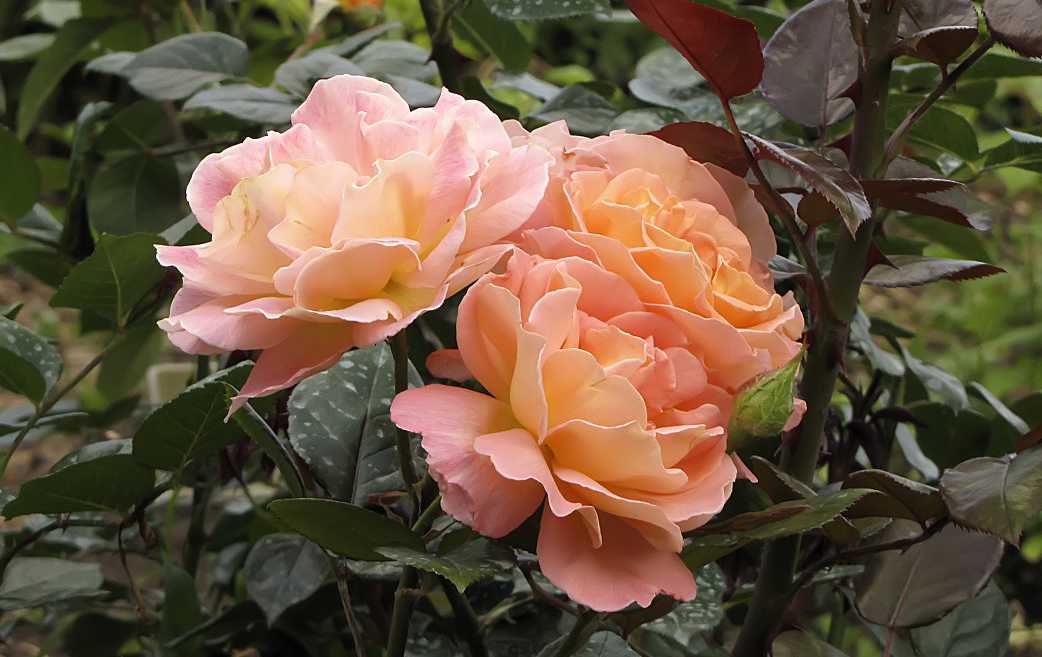 Популярным среди цветоводов сорт Лаки Пис, с необычными, двусторонними лепестками: внизу лепестки оранжевые с красным оттенком, а вверху розовые с абрикосовым оттенком. Куст очень компактный, высотой до 80 см. Лепестков на распустившемся бутоне до 50 штук.