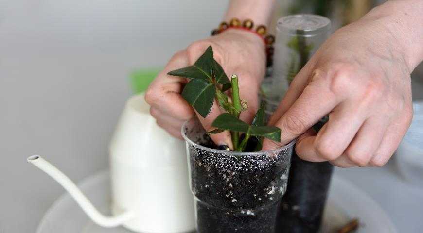 В бороздки черенки просто размещают под наклоном, обжимая почвой. При посадке в контейнеры удобно пользоваться палочкой или карандашом, проделывая отверстия. Черенки высаживают под небольшим наклоном (до 45 градусов), погружая веточки на 1,5-2 см, так, чтобы нижняя почка оказалась в земле. Субстрат аккуратно обжимают, фиксируя черенки. При посадке в саду и теплице высаженные черенки поливают. При желании, для уменьшения рисков загнивания и распространения плесени поверхность почвы и черенки можно опрыснуть раствором системного фунгицида.