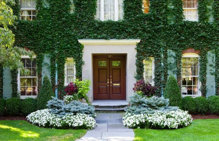Клумба у стены. Если места недостаточно, скромный цветник перед домом можно расширить в вертикальной плоскости. Для этого у стены размещают большие вазоны и контейнеры. На стене крепят шпалеру, чтобы вьющиеся растения (плющ, хмель, лимонник, клематисы) создали пышную зеленую стену.