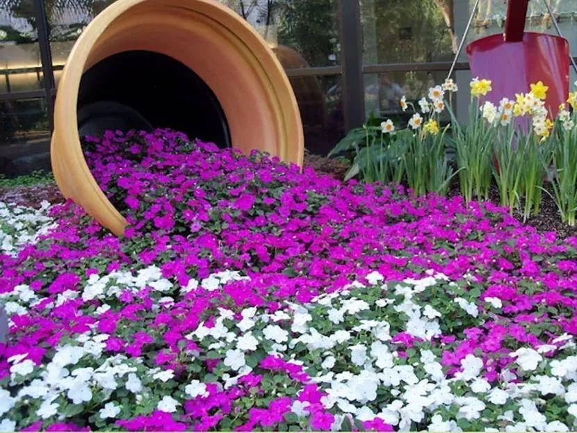 Цветочный ручей. Цветочную посадку всегда можно оживить, используя аналогию с ручьем. Для воплощения подойдет лежащий на боку кувшин, деревянная бочка или плетеная корзина.