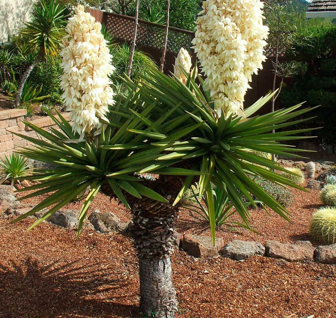 Ее плоды съедобны и напоминают сладкий картофель по вкусу, а внешне похожи на бананы. У такой юкки очень грубый и короткий ствол, голубоватые листья, и вырастает она до 1,5 м.