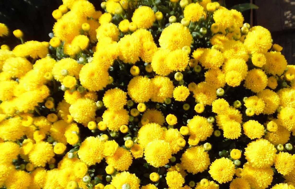 - Кнопа. Сорт с желтыми помпонными хризантемами до 3 см. Кусты растут до 35 см. Отличаются обильным цветением, которое начинается в конце сентября-октябре.