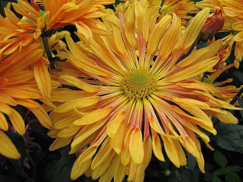 - Оранжевый закат. Многолетние хризантемы с прямыми ветвящимися стеблями высотой до 1 м. Махровые оранжево-коричневые цветки раскрываются до 10 см.