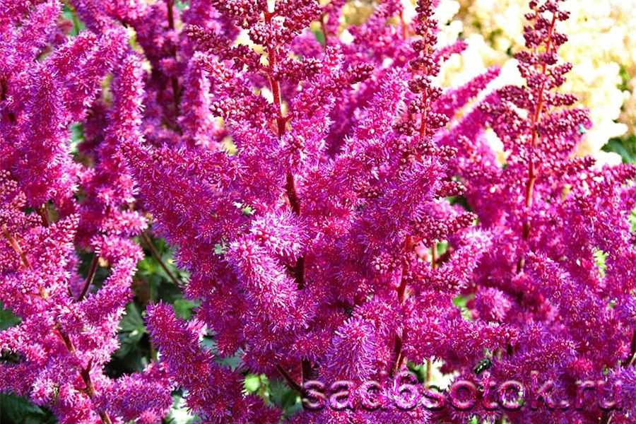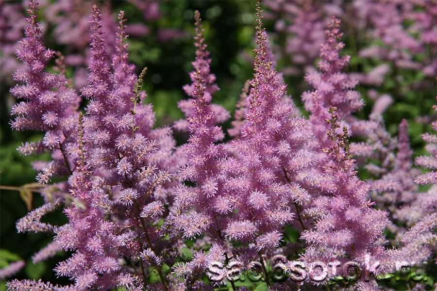 - Astilbe chinensis taquetii «Purpurlanze» соцветия необыкновенно яркого сиреневого колера;