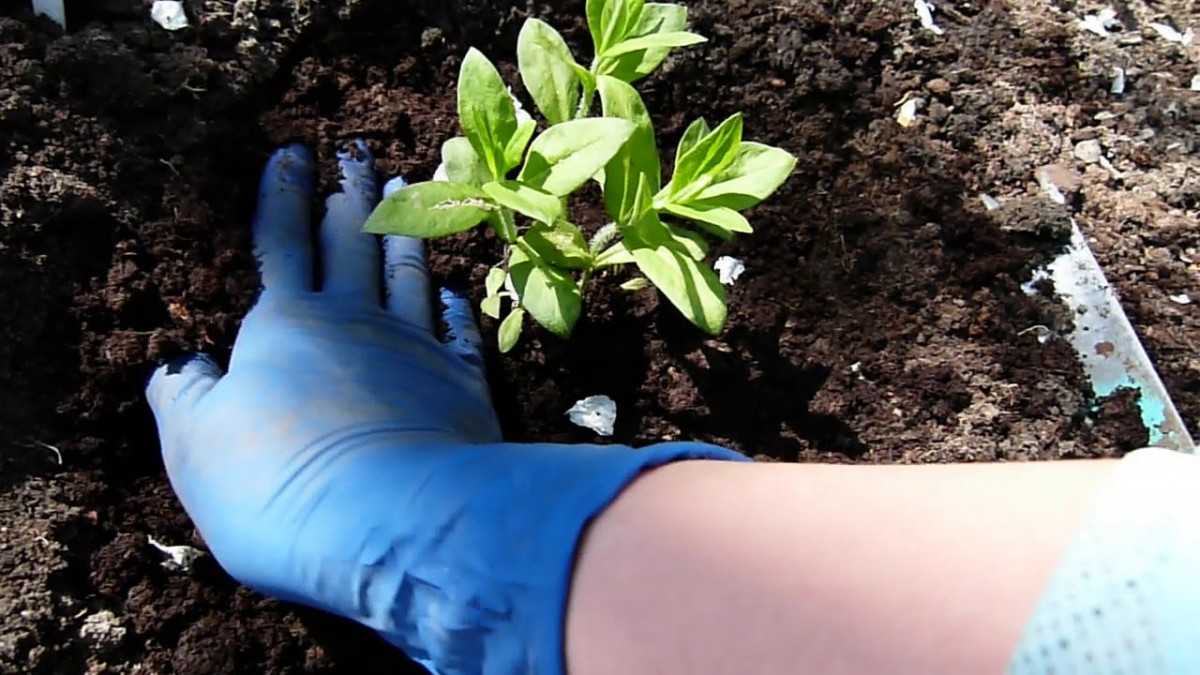 - В мае высаживают рассаду на постоянное место. В этот период подкармливают азотистыми удобрениями, растворенными в воде. Расстояние между кустиками должно быть до 20 см, поливать водой с удобрениями надо в междурядье.