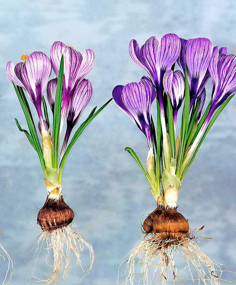 Крокусы – это невысокие растения, которые достигают всего десяти сантиметров в высоту. Корневая система представлена в виде сплюснутых или округлых луковиц, которые в диаметре могут достигать трех сантиметров. Луковицы полностью окутаны чешуйками, а также имеют небольшой пучок мочковатых корешков. Стебель у крокусов практически отсутствует. Однако из корней появляются линейные, узкие листочки, которые могут вырастать во время или уже после цветения.