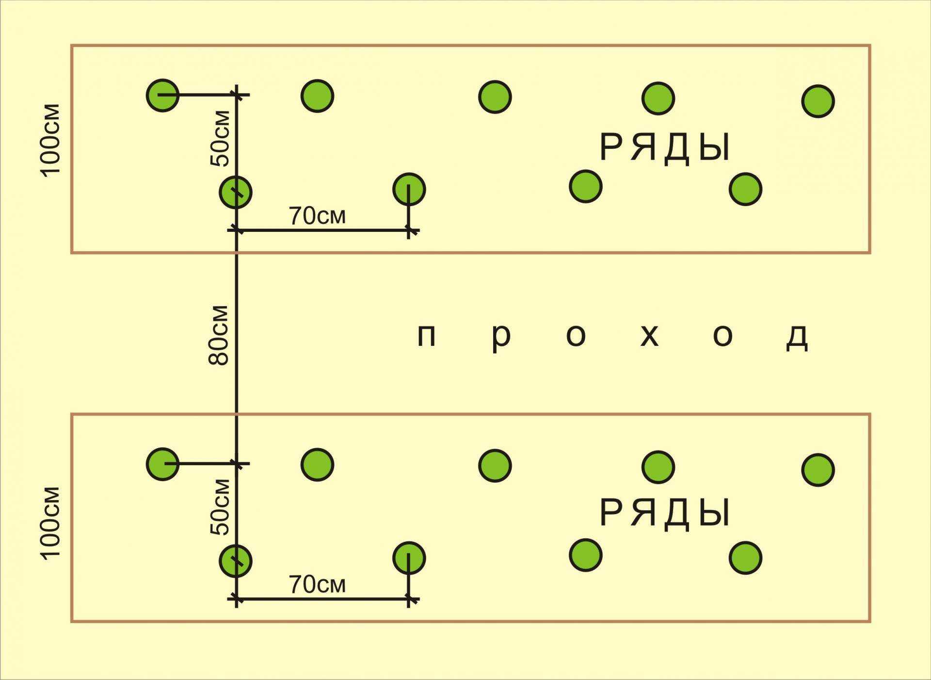 - Если это раннеспелые сорта невысокого роста, разрешается сократить расстояние между кустиками до 30 см. Ширина между рядами — 50 см.